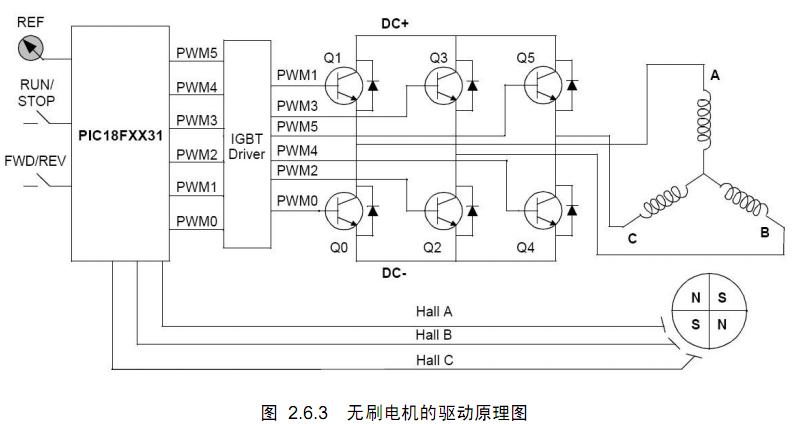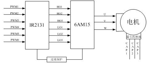 要转化成三相的?为什么? PWM 模块用于驱动IGBT 模块,然后去控制电机 6路PWM输出连接到3对MOSFET驱动器(如IR2101S) ,最终链接到6个MOSFET(IRFR2407) PWM的占空比还是可以调节速率的 前置驱动芯片采用的是IR公司的MOSFET驱动芯片IR2131,具有集成度高、可靠性好、速度快、过流欠压保护、调试方便等特点。IR2131 内部设计有过流、过压及欠压保护。 microchip也有驱动器,TC1426反向 TC1427不反向 功率驱动电路采用24V供电,驱动电路与电机的连接采用三相全桥方式,电机工作在三相六状态模式下。以任一时刻电机只有两相导通的方式来控制换流元件。PWM调制的方式是软斩波方式,即导通时下桥臂功率管始终保持开状态,上桥臂功率管的开关由PWM信号决定。功率开关管采用HITACHI公司的集成功率开关器件6AM15,其内部集成3个N型MOSFET管和P型MOSFET管,构成三相全桥功率开关电路。与采用六个分立MOSFET管相比,有利于提高集成度,减少电路板面积,增加可靠性。每个MOSFET管自带超快恢复二极管,在MOSFET管关闭期间起反向续流作用。