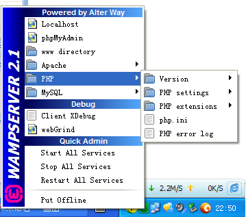 WampServer 2 is the new version of WAMP5 托盘很方便,但是一次运行feng office怎么上传文件大小只有2M改不过来,修改了php.ini也不生效,e2php和xmapp下不存在此问题 WAMP : Windows + Apache + MySql + PHP;对比LAMP即Linux+Apache+MySql+PHP;