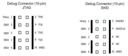 SWD:口线更少 Serial Wire Debug (SWD) SWD为pin有限的应用提供了一个调试的端口,主要是面向small package的微控制器,也面向复杂的ASICs—pin数量有限并且成本控制的应用。 SWD使用一个时钟+双向数据管脚来取代5-pin的JTAG端口,提供了所有的通用的JTAG调试和测试功能,并且增加了:在没有中断内核以及没有增加额外的代码的情况下,对系统内存的实时访问。SWD使用了一个ARM标准的双向有线协议,这已在ARM Debug Interface v5中定义。SWD在调试器和目标系统之间用一种高效标准的方式互相传送数据。它是ARM-based设备的标准接口。