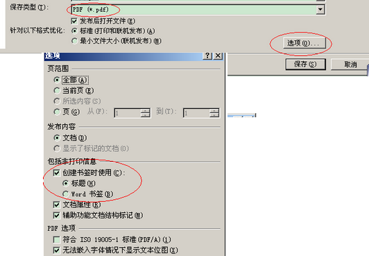 在word里面通过打印机打印则不行,得另寻它法 如果word加载宏里面有foxit或adobe虚拟打印机的加载项,点击生成pdf也会自动带上标签 wps生成的pdf标签不太精确,比如同一页面的多个标题,它只调到同一个位置,即此页的页头,而不是像习惯的那样,调到相应的行 发现,高版本的word,比如word2010,可以直接另存为pdf了,并且可生成比较准确的标签: 在另存为pdf的时候,点击对话框中的选项按钮,然后选择根据什么生成标签
