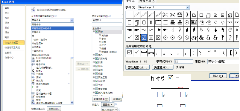 因着这个时间学会了调用没有在外面显示的word功能 word2007或2010中没有了菜单,有些功能一下子找不到;其实也是能找到的: 点击左上角向下的箭头 —–>选择“其他命令” —>在弹出的对话框中选择“自定义功能区” —>从“下列位置选择命令”中选择“不在功能区中的命令” —->右侧需要新建一个组才行 如此,对没有了菜单的office系统使用起来心里就更有谱了 在本例中,找到复选框即可