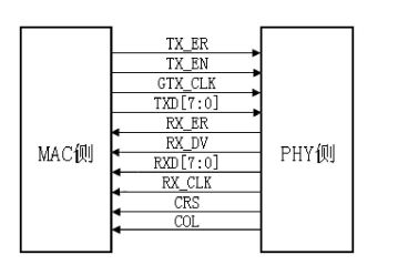 SMII即 Serial MII,串行 MII的意思,跟 RMII相比,信号线数据进一步减少到 3根; TXD:发送数据信号,位宽为 1; RXD:接收数据信号,位宽为 1; SYNC:收发数据同步信号,每 10个时钟周期置1次高电平,指示同步。 CLK_REF:所有端口共用的一个参考时钟,频率为 125MHz,为什么 100Mbps 速率要用 125MHz 时钟?因为在每8 位数据中会插入2 位控制信号,请看下面介绍。 TXD/RXD 以 10 比特为一组,以 SYNC为高电平来指示一组数据的开始,在 SYNC 变高后 的 10 个时钟周期内,TXD 上依次输出的数据是:TXD[7:0]、TX_EN、TX_ER,控制信号 的含义与 MII接口中的相同; RXD 上依次输出的数据是: RXD[7:0]、 RX_DV、 CRS, RXD[7:0] 的含义与 RX_DV 有关,当 RX_DV 为有效时(高电平),RXD[7:0]上传输的是物理层接收的 数据。当 RX_DV为无效时(低电平),RXD[7:0]上传输的是物理层的状态信息数据。 千兆以太网MII接口类型主要有GMII、RGMII、SGMII、TBI和RTBI 五种 GMII 接(如下图):