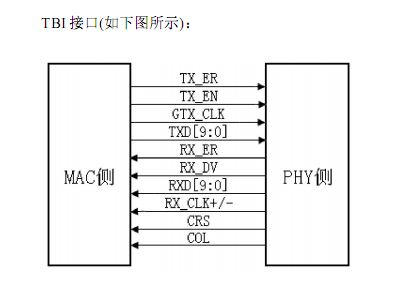 TBI即Ten Bit Interface的意思,接口数据位宽由GMII 接口的 8位增加到 10位,其实,TBI接口跟GMII 接口的差别不是很大,多出来的2位数据主要是 因为在TBI接口下,MAC芯片在将数据发给PHY芯片之前进行了8B/10B变换 (8B/10B变换本是在PHY芯片中完成的,前面已经说过了),另外,RX_CLK+/- 是从接收数据中恢复出来的半频时钟,频率为62.5MHz,RX_CLK+/-不是差分 信号,而是两个独立的信号,两者之间有180 度的相位差,在这两个时钟的上升 沿都采样数据。RX_CLK+/-也叫伪差分信号。除掉上面说到的之外,剩下的信号 都跟GMII 接口中的相同。 大多数芯片的TBI接口和GMII 接口兼容。在用作TBI接口时, CRS和 COL 一般不用。 RTBI接口 RTBI即Reduced TBI,简化版TBI,接口数据位宽为5bit,时钟频率为 125MHz,在时钟的上升沿和下降沿都采样数据,同RGMII 接口一样,TX_EN 线上会传送TX_EN和TX_ER两种信息,在时钟的上升沿传TX_EN,下降沿传 TX_ER;RX_DV线上传送RX_DV 和RX_ER 两种信息,在RX_CLK上升沿传 RX_DV,下降沿传RX_ER。