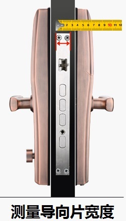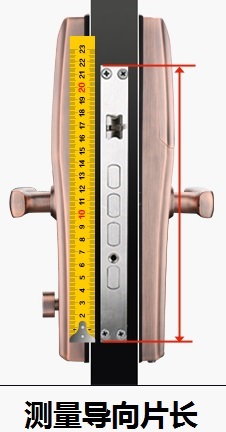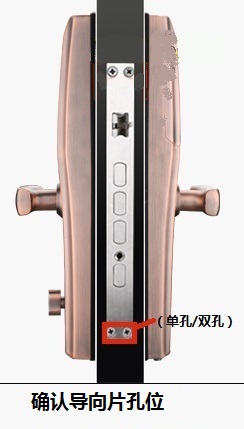 指纹门锁信息采集1.确认开门方向 选项: 左内开右内开左外开右外开 2.确认门体厚度(单位:mm) 3.测量导向片长度(单位:mm) 4.测量导向片宽度(单位:mm) 5.确认导向片孔位 确认是单孔还是双孔 6.是否有天地钩 用手摸门顶边沿,有无锁孔;在门锁处于弹开状态,门顶边沿有无锁舌弹出;木门安装无需天地钩 有天地钩 无天地钩 7.是否为霸王锁体(霸王锁体,标准是38838 或者38840(mm)) 是 否 指纹锁控制模块配置目前一把联网型指纹锁配一个模块